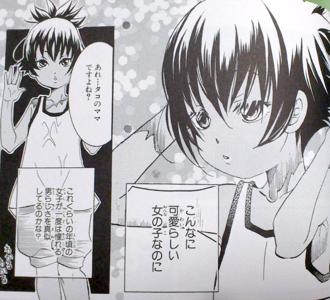 今回のお話の中で注目は、ぴかりと新キャラ岬こころとの出会い、文化祭前夜に起きた姉ちゃん先輩と黒髪の美少年「ピーター」との不思議な出会い。岬こころは、あまんちゅ!では初の子供のキャラ、ARIAの灯とアイちゃんのような先輩後輩を彷彿とさせてくれます。ピーターとの日常から迷い込んだ「非日常」な体験、ピーターが姉ちゃん先輩が自分とは違って「今」を生きる人だと知った時の寂しい表情が印象的な、天野こずえ版ピーターパンとウェンディ。日常を描いた描写が多い分、非日常な夜の学校が映えます。